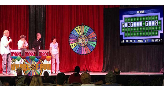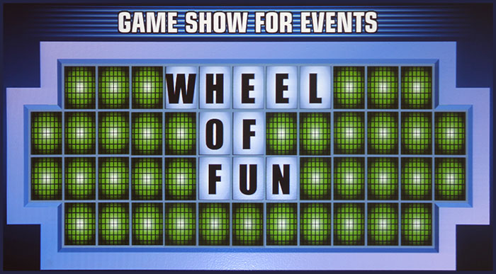 The Custom Wheel Of Fun Game Show is loosely based on a popular wheel game that has a long history and is rich in tradition. As with all of our game show productions, we have designed this show for live performances. Unlike many of our other game shows, Custom Wheel Of Fun game doesn't use trivia, just player positions, a wheel, and an on-screen puzzle. The puzzle can feature your message, or relate to your event, business or industry. Contestants spin the wheel and then earn points by guessing what consonants and vowels are in the puzzle. If the letters are hidden behind the squares, they are revealed. We have various ways to format the game for your event and can play long or short rounds depending upon how many contestants are in attendance. Use the puzzles included in the software or we'll customize them for you. Our giant wheel with flashing LED lights and all new Game Show Set create a game that will be the hit of the event! Book our Custom Event Wheel of Fun game show today!